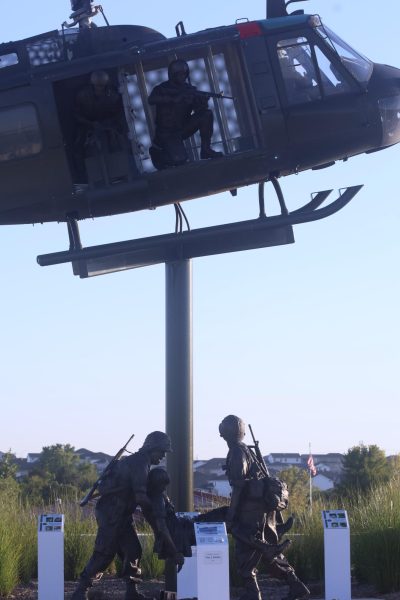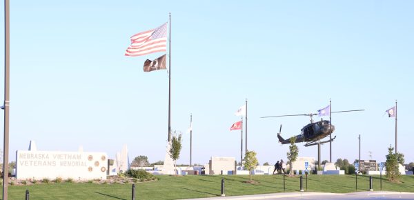 Heading south from the school on 108th Street, just past Foundation Field and SumTur Amphitheater, observant drivers and passersby can see a glimpse of helicopter blades sticking out above the curve of the horizon. Many surely have seen the helicopter, or parts of it, as it sits a few feet in the air, among tall flags and illuminating lights. What some might not recognize is that this helicopter is a UH-1 Huey, and is part of a depiction of a rescue mission led by Nebraska service members during the Vietnam War.